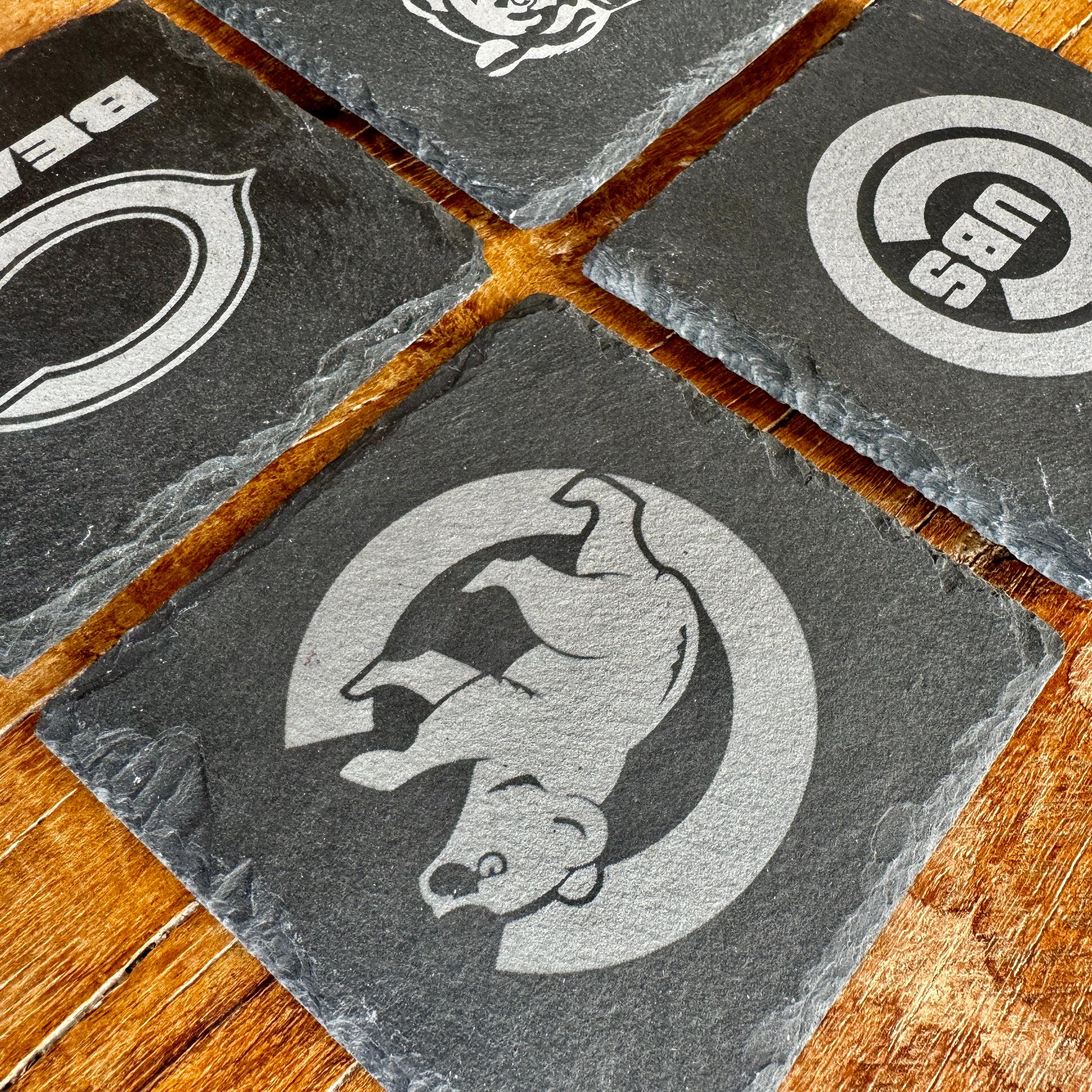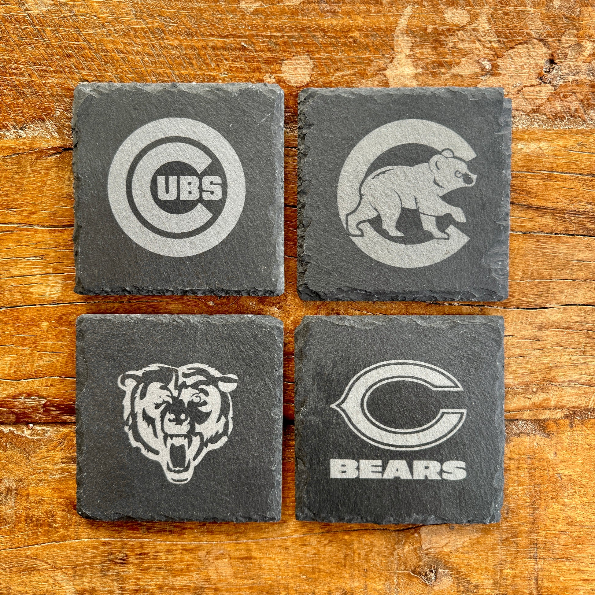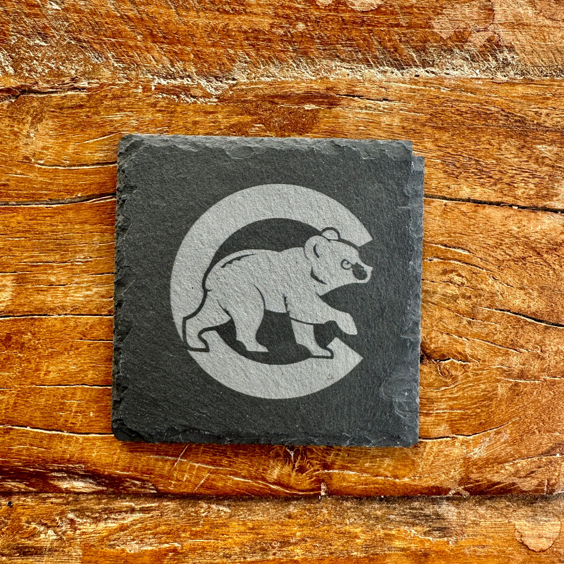 Set of 4 - This 100% waterproof slate coaster features a laser-engraved design of cubs, adding a touch of nature-inspired charm to your home or office. The durable slate material ensures long-lasting use, while the laser engraving creates intricate, high-quality detail that won't fade over time. Ideal for protecting your surfaces from spills and stains, this coaster combines functionality with artistic flair, making it a perfect gift for fans.