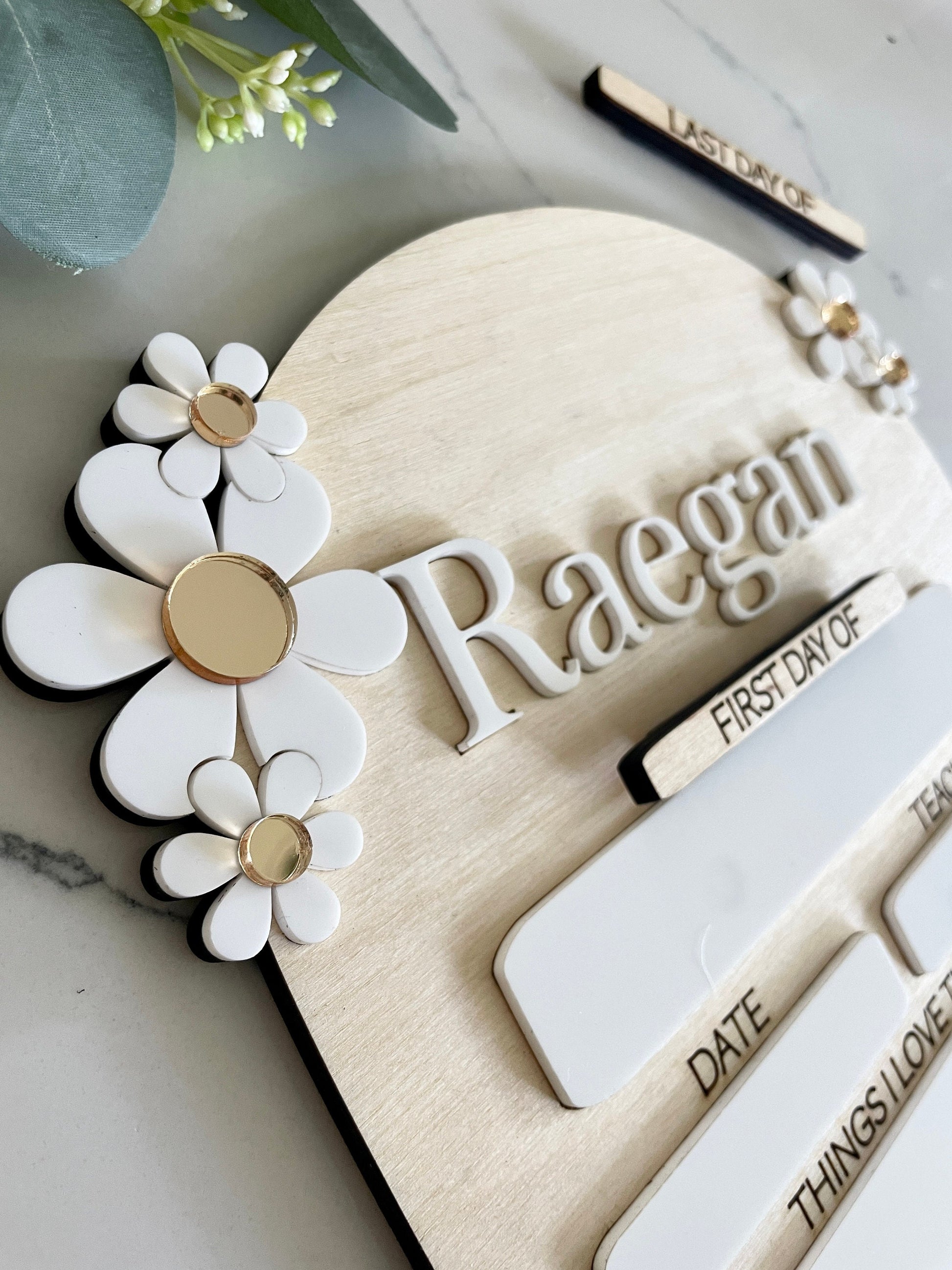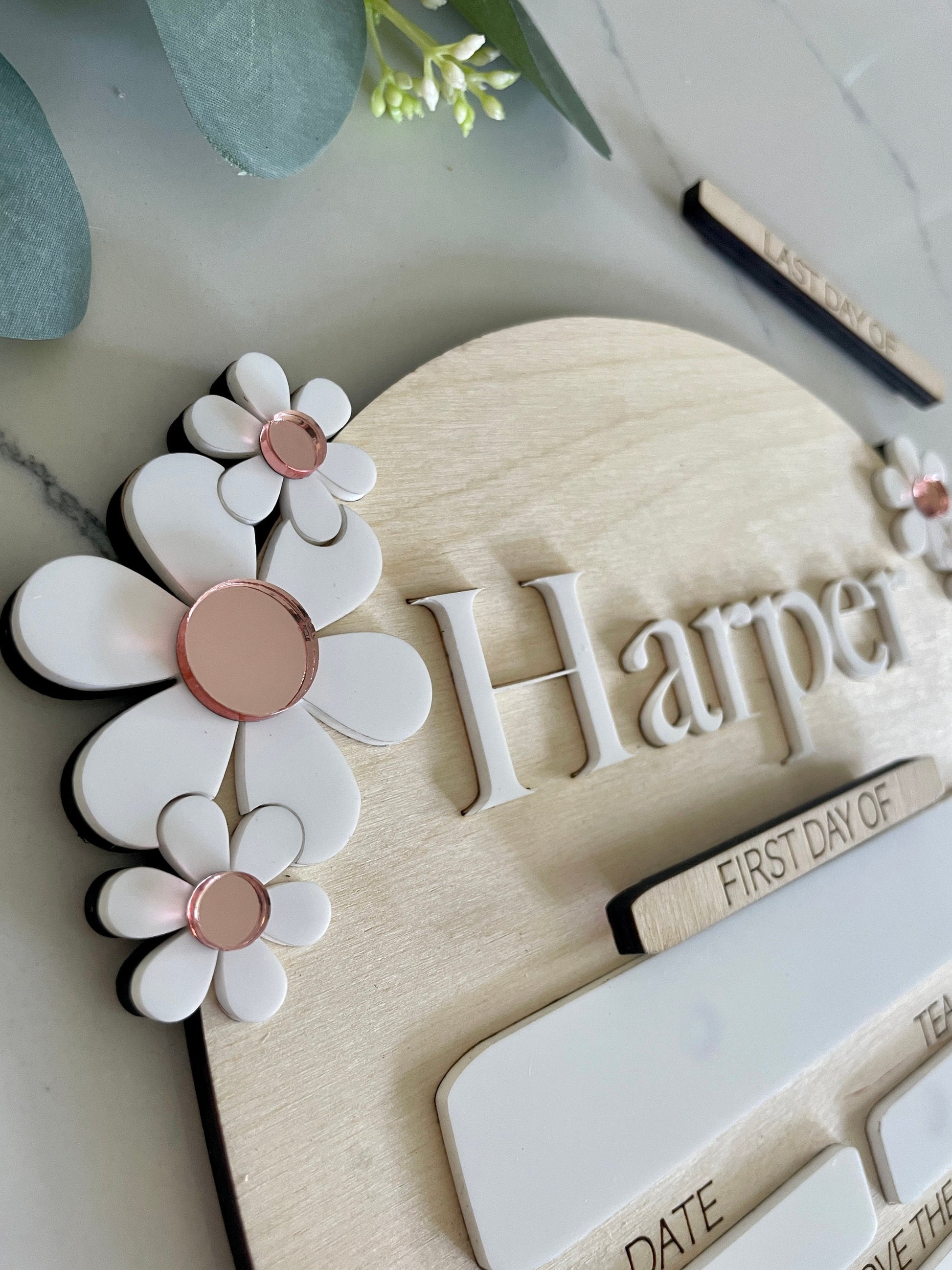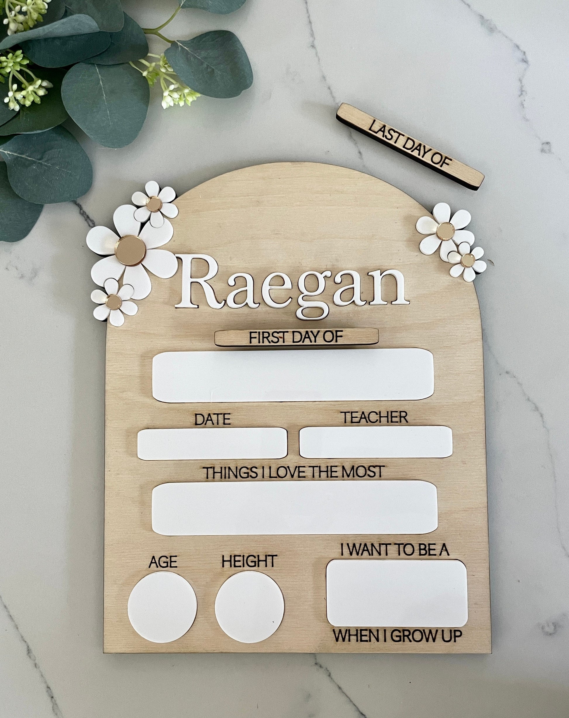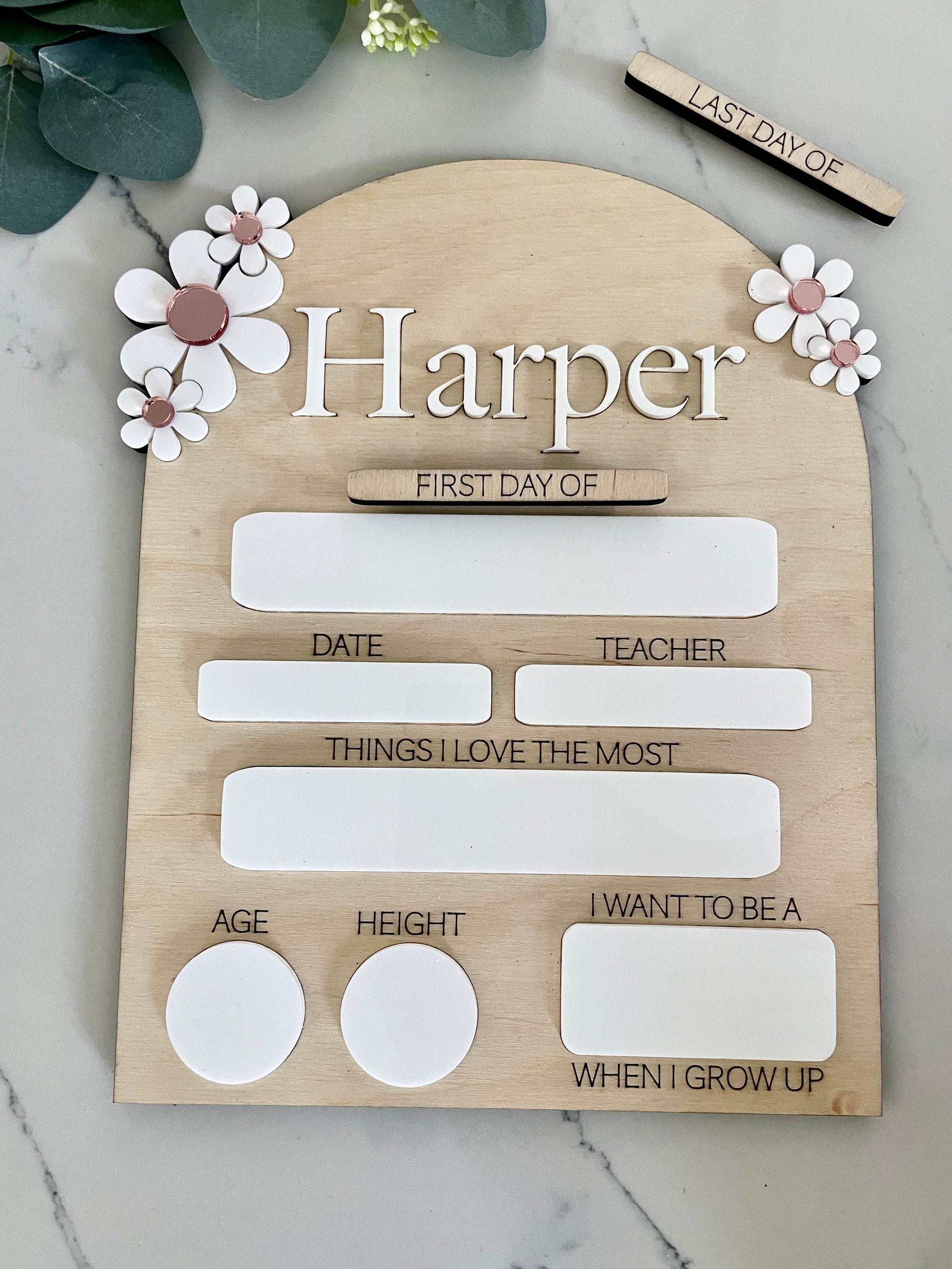 Introducing our delightful Daisy Style First Day of School Dry Erase Sign! Crafted with love from sturdy 1/4" Birch wood and adorned with charming acrylic accents, this sign is a perfect way to capture your child's first day of school memories.