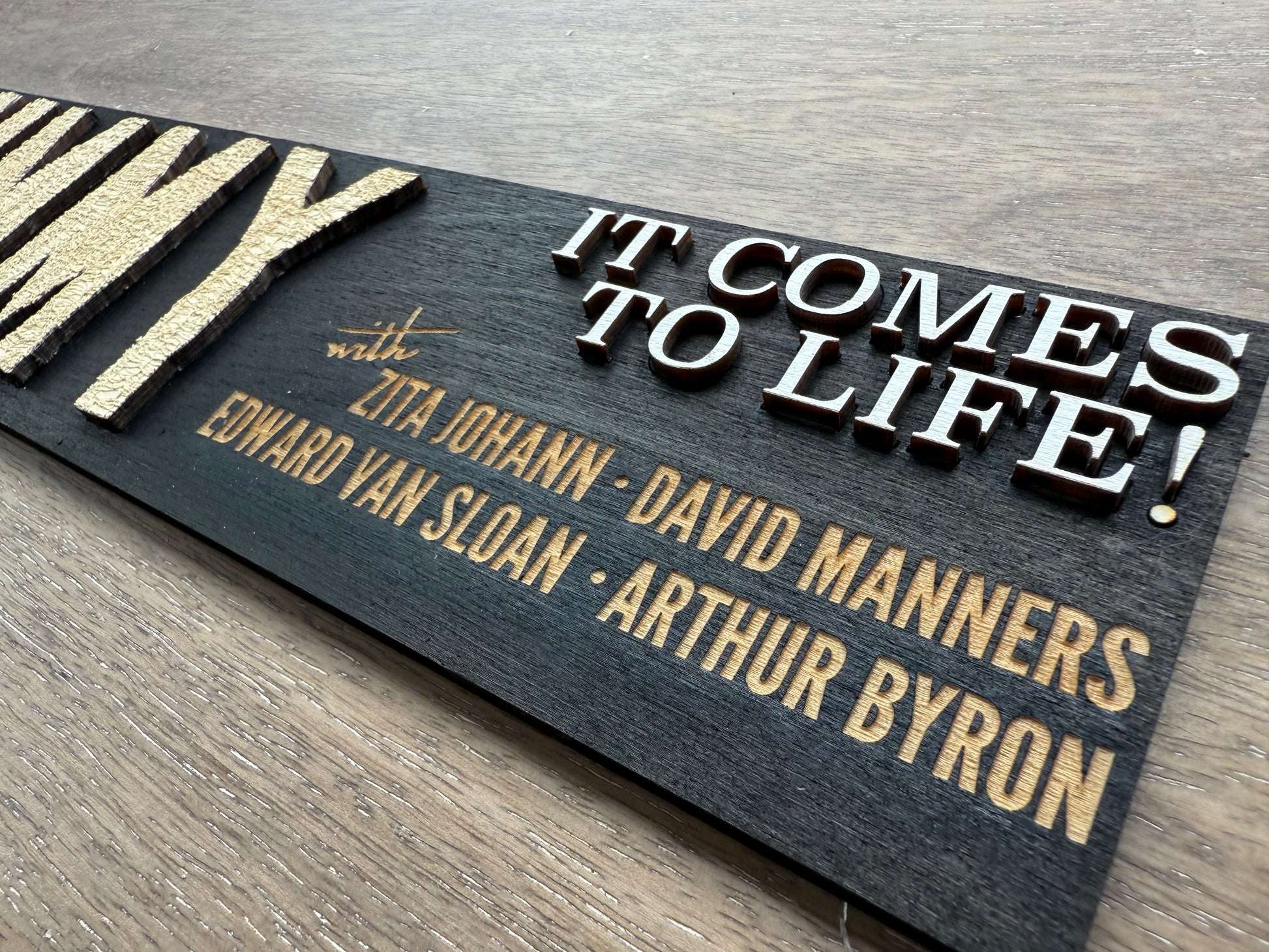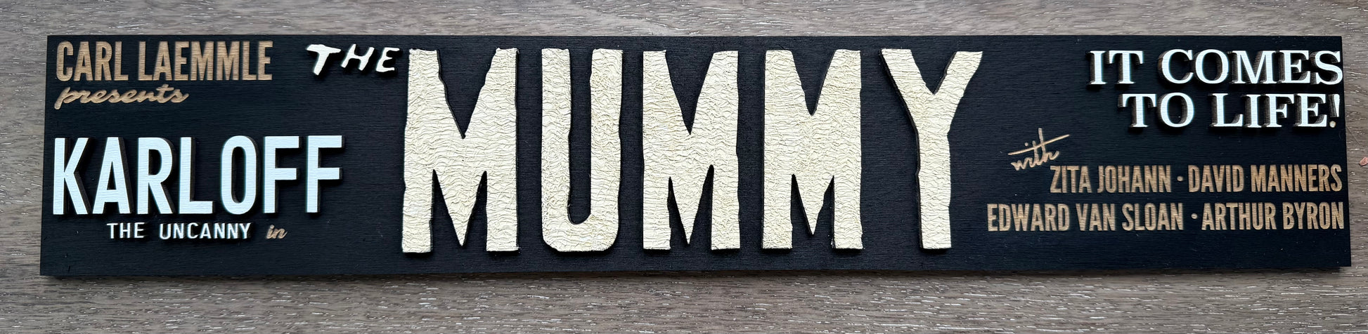 Immerse yourself in classic horror with this handcrafted wood sign featuring the original Mummy. Measuring 19 inches wide and 3.5 inches tall, this sign is made from high-quality Baltic Birch wood. It boasts intricate laser engraving and is hand-painted with a cloth wrapped letter for the “Mummy” title, adding a unique and eerie touch. The sign is sealed for durability and intended for indoor use only, making it an ideal addition to any horror fan's collection or man cave.
