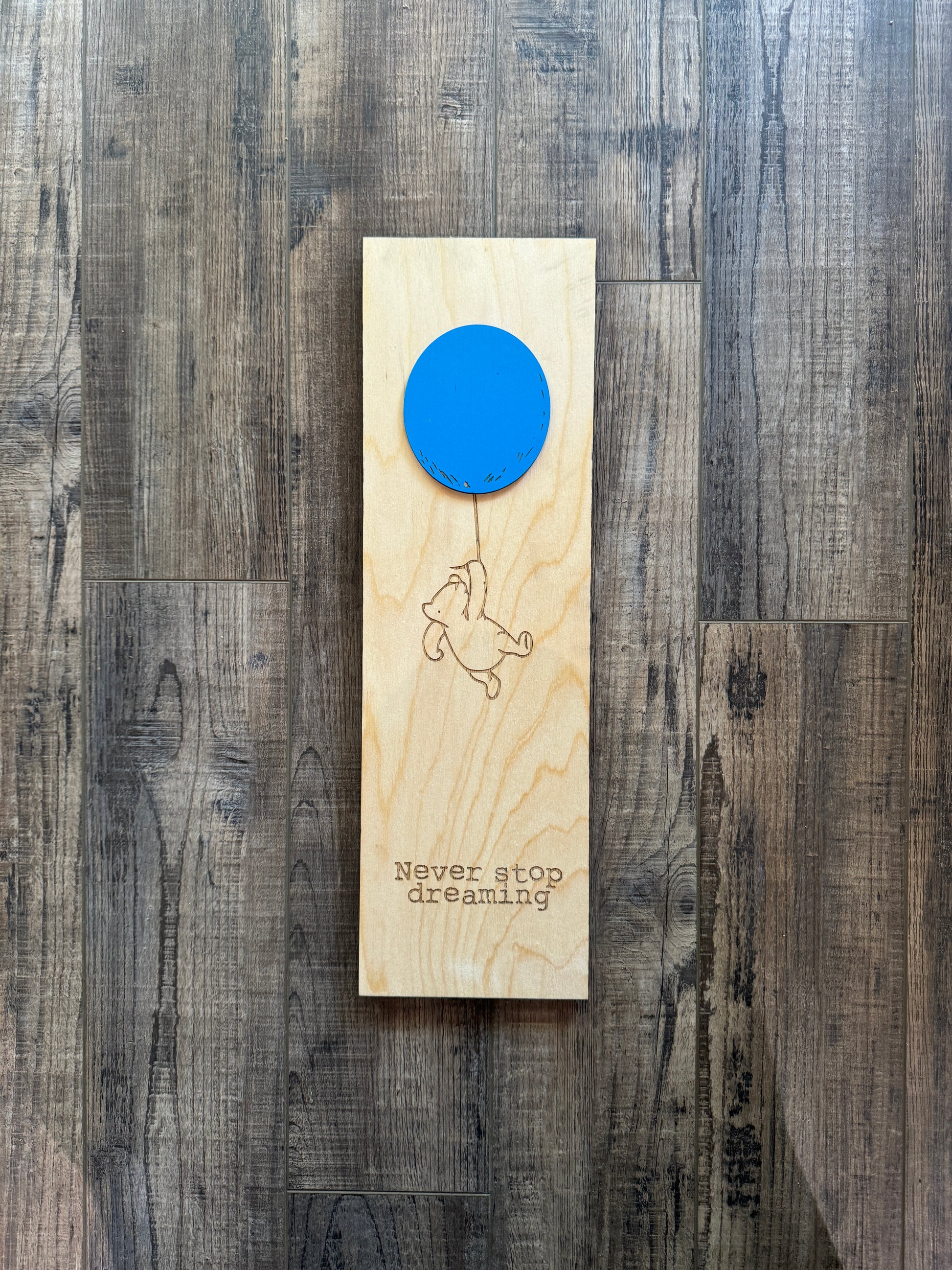 Bring the charm of the Hundred Acre Wood into your home with this handcrafted wood sign featuring Winnie the Pooh. Measuring 5.5 inches wide and 18 inches tall, this sign is made from high-quality Baltic Birch wood. It showcases detailed laser engraving and is hand-painted with care, then sealed for durability. Designed for indoor use only, this sign is perfect for decorating Winnie the Pooh nurseries or children's playrooms.